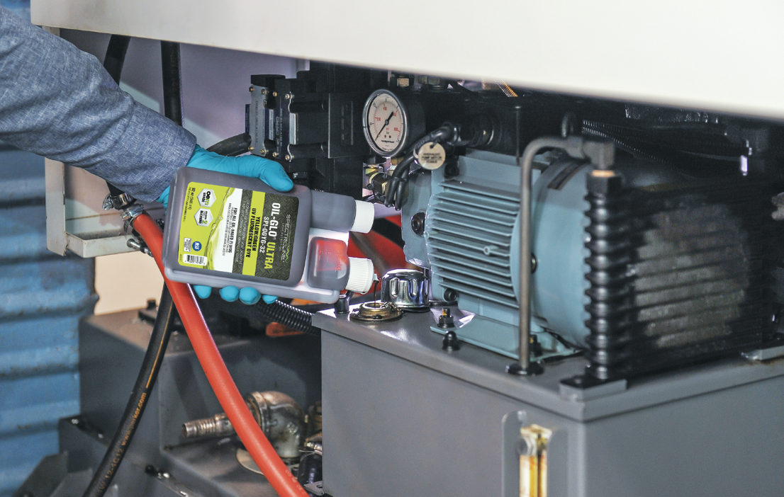泄漏檢測過程很簡單。根據油比和製造商的規格,將少量的熒光檢漏劑添加到設備的儲液罐中。染料與主體流體混合並在係統中循環。根據係統的大小,染料的完全循環可能需要一些時間。