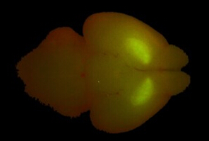 2. 研究者從小鼠大腦中提取GFP標記的背紋體。這項困難的工作因有了NIGHTSEA的DFP-1或BLS2(手電筒和眼鏡組合),而變得簡單:很容易看到大腦中的目標區域,從而讓解剖更準確、。