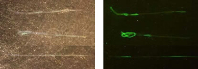 左圖:白光觀測 右圖:Royal Blue熒光觀測(Motic SMZ-186體視顯微鏡觀測)
