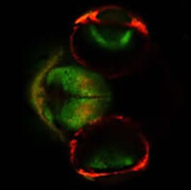 Kaede protein–綠色是未改變的,紅色是發生改變的,圖片由Robert Thorn(Creton Lab, 布朗大學)提供
