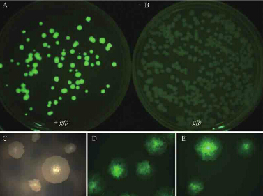本研究采用nightsea BLS2 BlueStar 藍lan色se手shou電dian筒tong和he濾lv光guang鏡jing對dui平ping板ban上shang的de結jie核he分fen枝zhi杆gan菌jun綠lv色se熒ying光guang蛋dan白bai菌jun落luo進jin行xing快kuai速su鑒jian定ding。該gai方fang法fa可ke以yi從cong幾ji百bai個ge菌jun落luo中zhong瞬shun間jian鎖suo定ding陽yang性xing克ke隆long。平ping板ban上shang的de菌jun落luo照zhao片pian拍pai攝she用yong單dan反fan相xiang機ji加jia載zai購gou自zinightsea公司的濾光片實現。